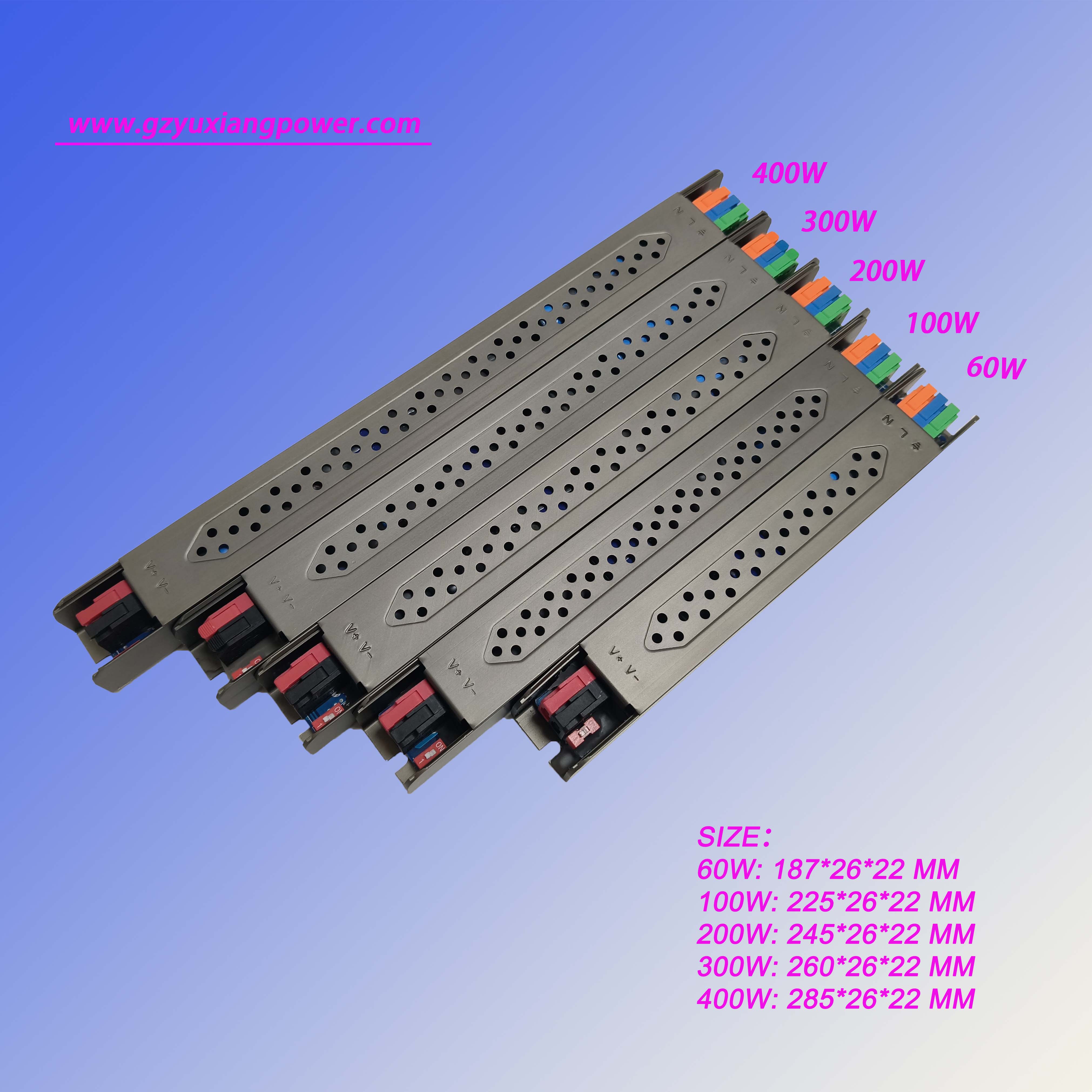 4. এই অতি-সংকীর্ণ সামঞ্জস্যযোগ্য LED পাওয়ার সাপ্লাই 60W, 100W, 200W, এবং সহ পাওয়ার রেটিং প্রদান করে400W, কমপ্যাক্ট স্পেস থেকে বৃহৎ-স্কেল প্রকল্পে বিভিন্ন বিদ্যুতের প্রয়োজনীয়তা পূরণ করে।